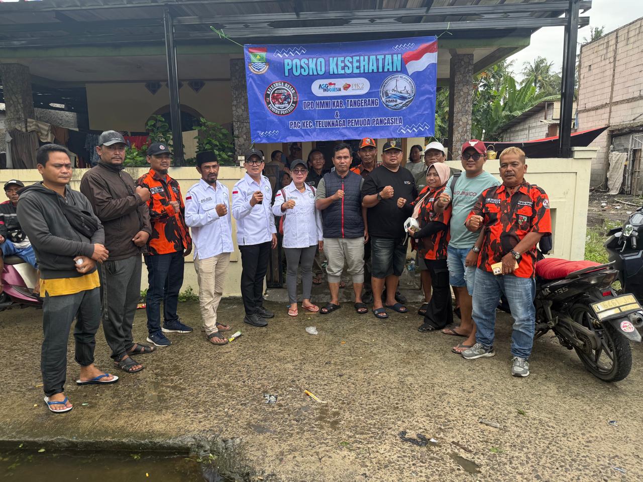 Teluknaga – newsoneindonesia.com | Kolaborasi DPD Himpunan Masyarakat Nelayan Indonesia (HMNI) Kabupaten Tangerang, Ormas Pemuda Pancasila Pimpinan Anak Cabang (PP-PAC) Kecamatan Teluknaga, Puskesmas Teluknaga, dan Pemerintah Desa (Pemdes) Kampung Besar mengadakan bakti sosial (baksos) Posko Kesehatan dan Check-up Gratis pasca banjir akibat hujan deras selama tiga hari.