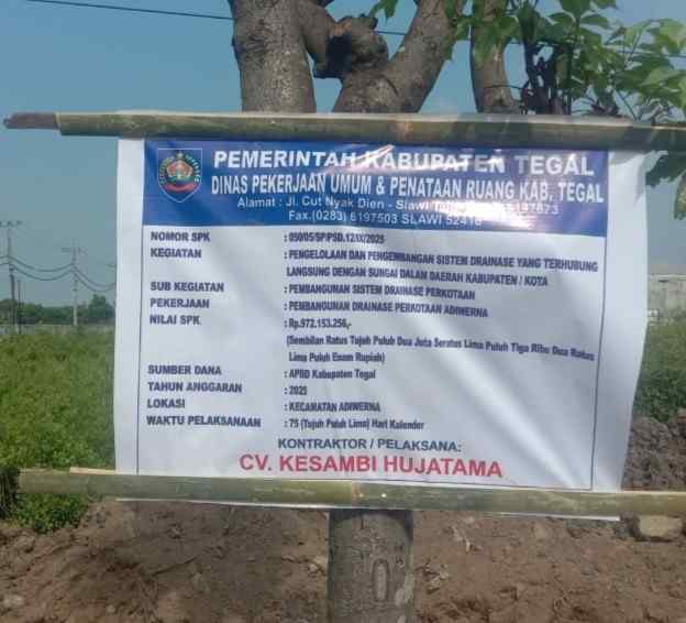 Proyek pembangunan drainase perkotaan di wilayah Kecamatan Adiwerna ini memiliki nilai anggaran sebesar Rp. 972.153.256,- (Sembilan Ratus Tujuh Puluh Dua Juta Seratus Lima Puluh Tiga Ribu Dua Ratus Lima Puluh Enam Rupiah), bersumber dari APBD Kabupaten Tegal Tahun 2025.