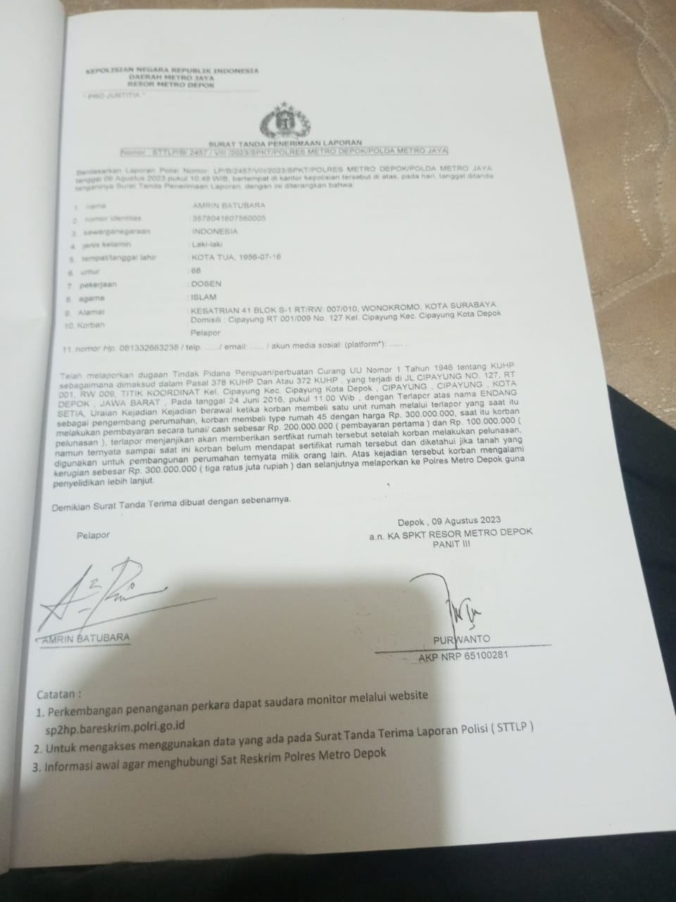 Pelaporan dugaan tindak pidana ini tercatat dalam Nomor Laporan Polisi: STTLP/B/2457/VIII/2023/SPKT/POLRESMETRODEPOK/POLDA METRO JAYA, dengan dugaan pelanggaran Pasal 378 dan 372 KUHP tentang penipuan & penggelapan.