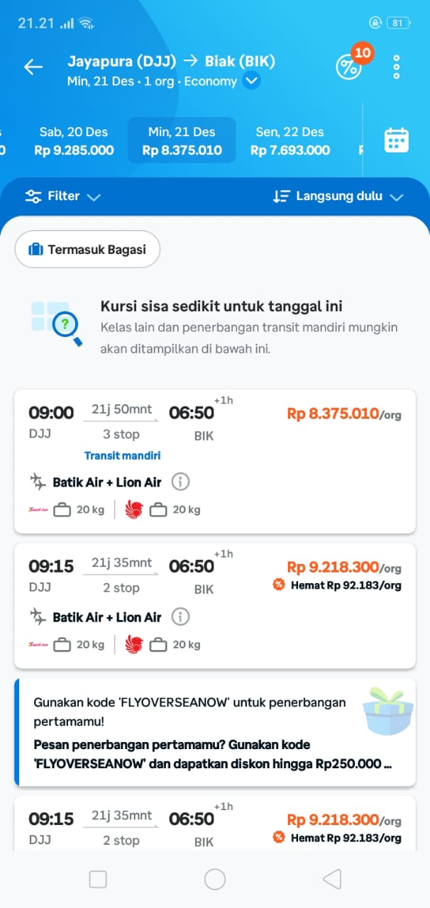 Pantauan di berbagai kanal penjualan tiket menunjukkan harga tiket pesawat Jayapura-Biak mengalami kenaikan di atas rata-rata hari biasa.