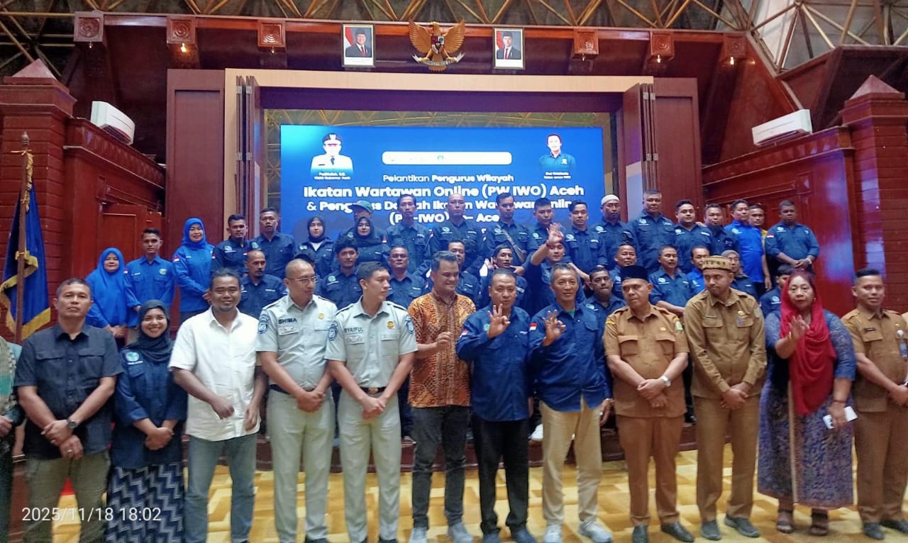 newsoneindonesia.com||Banda Aceh – Ikatan Wartawan Online (IWO) Aceh resmi melantik pengurus periode 2025–2029 dalam sebuah seremoni khidmat di Anjong Mon Mata, Selasa (18/11/2025). Acara ini dihadiri oleh sejumlah pejabat teras Aceh dan perwakilan institusi strategis.
