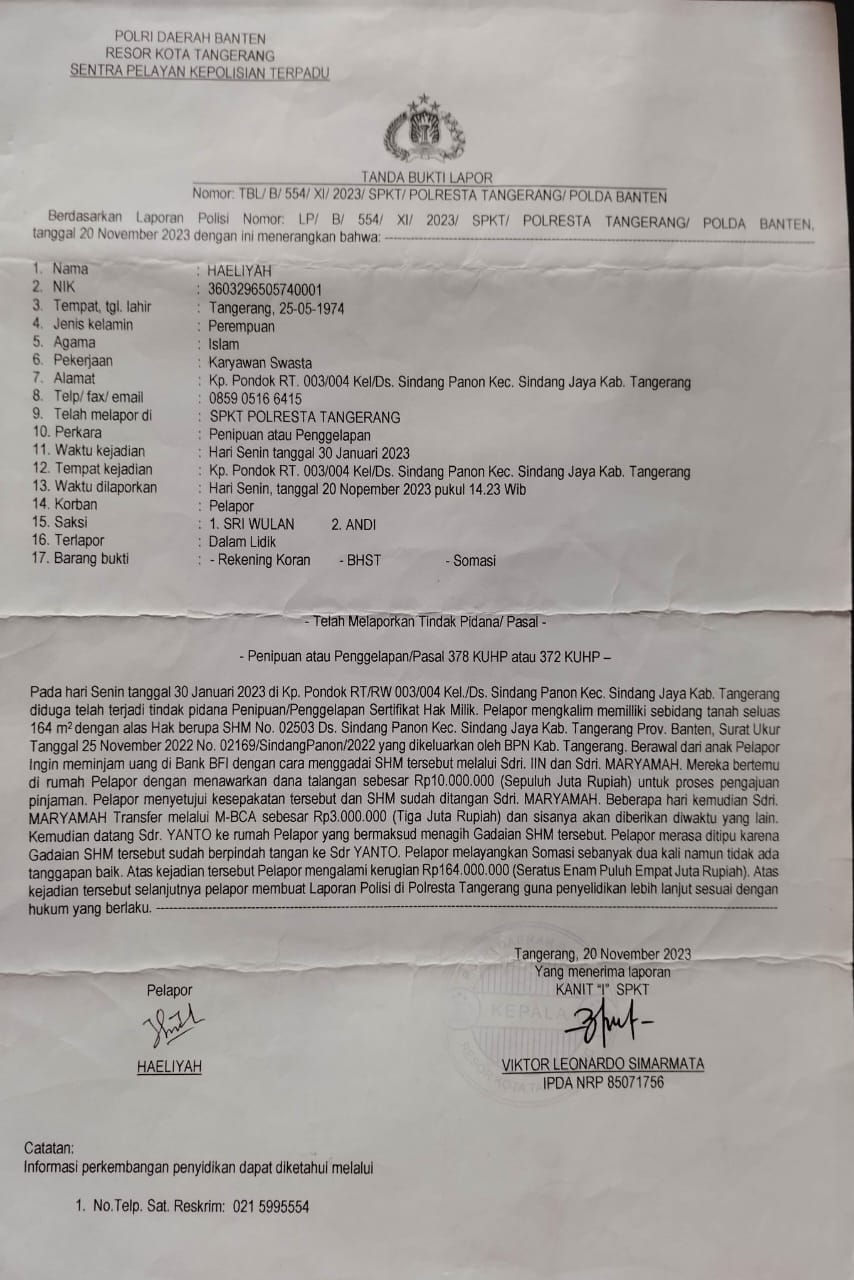newsoneindonesia.com||Tangerang- Keluarga Ibu Haeliyah, warga Kampung Pondok RT 003 RW 004, Desa Sindang Panon, Kecamatan Sindang Jaya, Kabupaten Tangerang, mendesak kepastian hukum atas laporan dugaan tindak pidana penipuan atau penggelapan sertifikat hak milik (SHM) yang hingga kini belum menunjukkan perkembangan berarti sejak dilaporkan pada 20 November 2023.(16/11/2025)