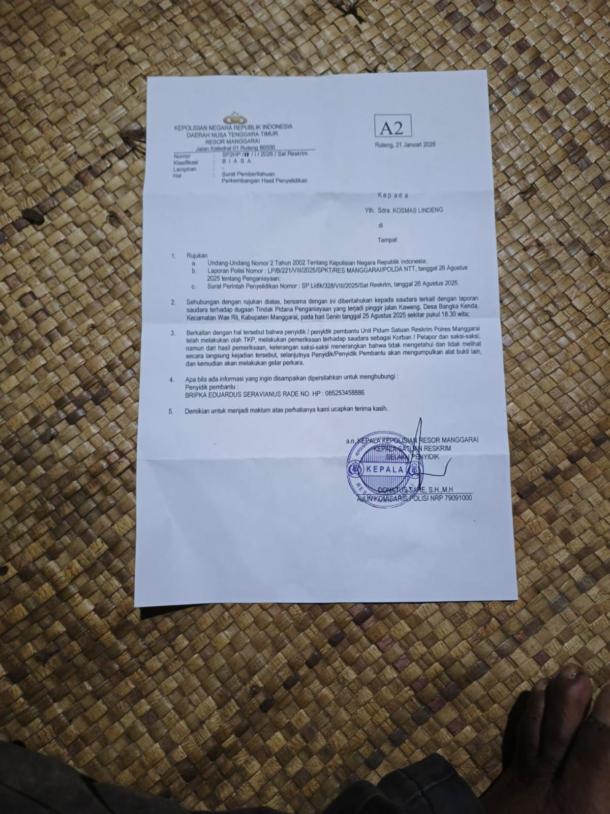Laporan Polisi Terlambat Ditangani Keesokan paginya, 26 Agustus 2025, keluarga buru-buru membuat laporan ke Polres Manggarai. Surat Tanda Penerimaan Laporan (STPL) diterbitkan dengan nomor PTL 0948/SEKS RESKRIM/RES MANGGARAI/2025 atau LP/B/0948/VIII/2025/SPKT/RES MANGGARAI. SP2HP pertama baru diterima pada 2 Oktober 2025—dua bulan setelah laporan.