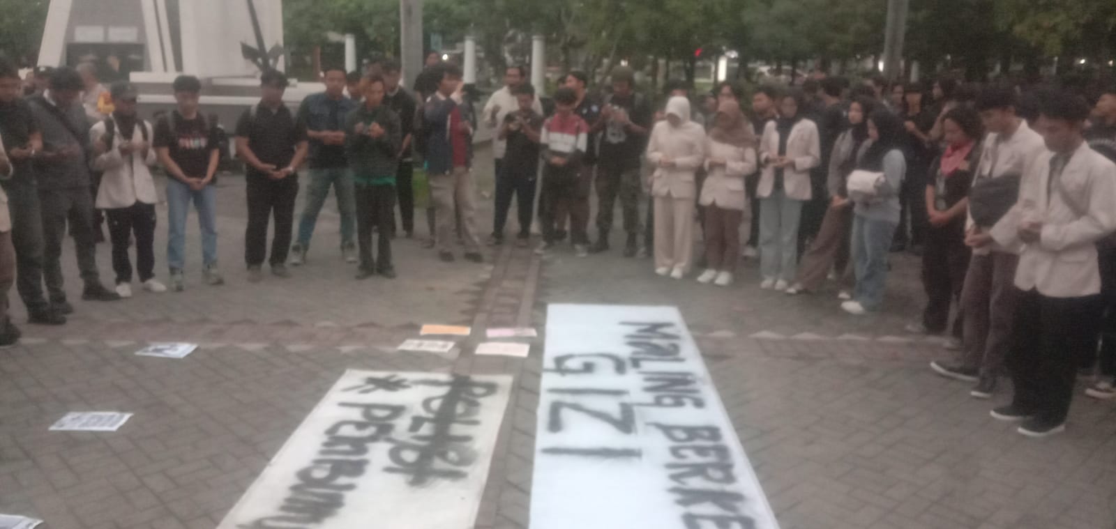 Mahasiswa membentangkan spanduk bertuliskan ‘Maling Berkedok Gizi’. Tulisan itu menjadi simbol protes atas kualitas makanan MBG yang dinilai jauh dari kata layak.