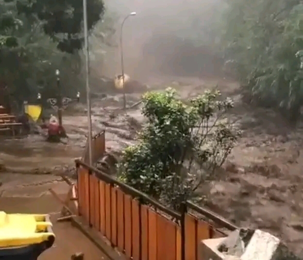 Di tengah kehancuran itu, ada satu pemandangan yang kontras. Tugu Guci besar berwarna kuning emas masih berdiri kokoh, seolah menjadi saksi bisu ganasnya alam yang baru saja melanda. Sementara di sekelilingnya, area Pancuran 13 kini penuh dengan timbunan pasir dan bebatuan besar.