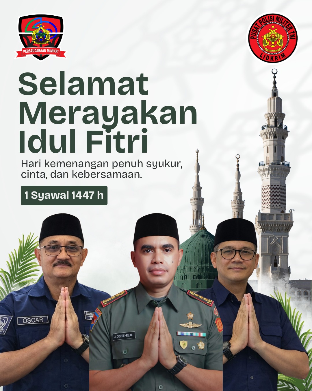 Jakarta, newsoneindonesia.com — Dalam momentum perayaan Hari Raya Idul Fitri 1447 Hijriah, Persaudaraan Mimikri bersama Pusat Polisi Militer Tentara Nasional Indonesia (Puspom TNI) menyampaikan ucapan selamat kepada umat Muslim di seluruh Indonesia. Ucapan tersebut disampaikan melalui pernyataan resmi yang dipublikasikan di berbagai platform media.