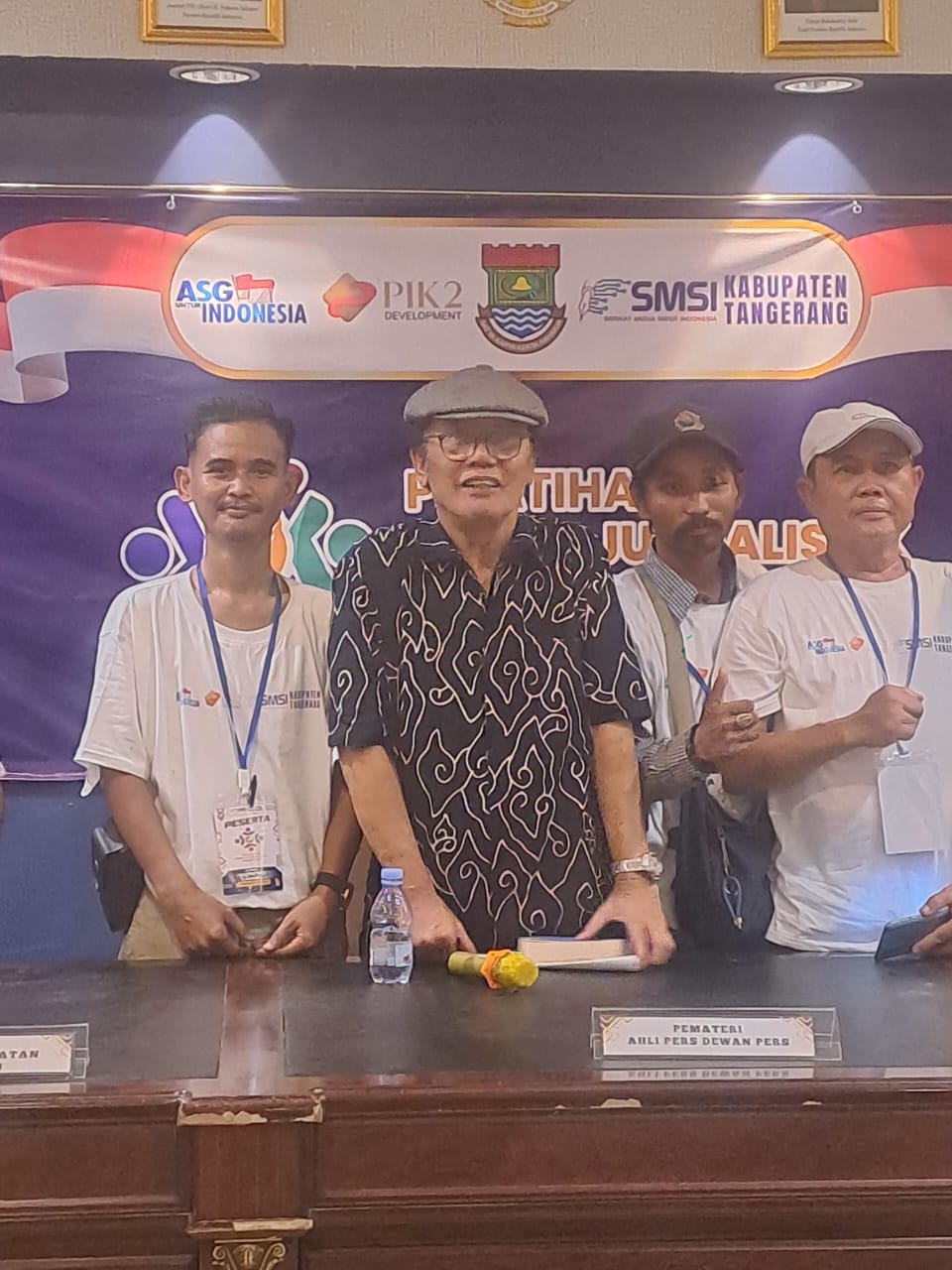 Tampak hadiri Ketua SMSI Provinsi Banten Lasman Bangun, Ketua PWI Kota Tangerang Herwanto, Perwakilan dari PWI Pusat Ahmad Fauzi Chan, Komisaris PIK 2 Development ( ASG ), Pengurus /SMSI Kab Tangerang, Jhoni Ardiansyah, SMSI Kota Tangerang Zaki. dan peserta Pelatihan Karya Jurnalistik sejumlah 80 orang.