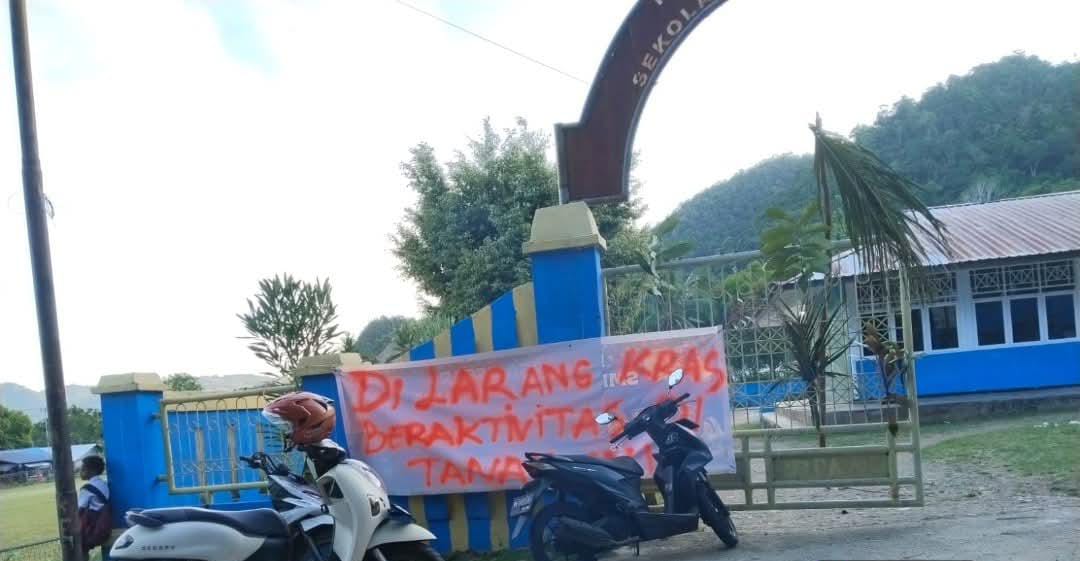 Pemalangan dilakukan dengan memasang kayu dan spanduk di pintu masuk utama sekolah, sehingga menyebabkan siswa dan guru tidak dapat memasuki area bangunan.