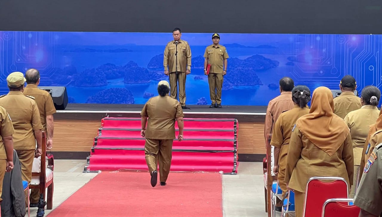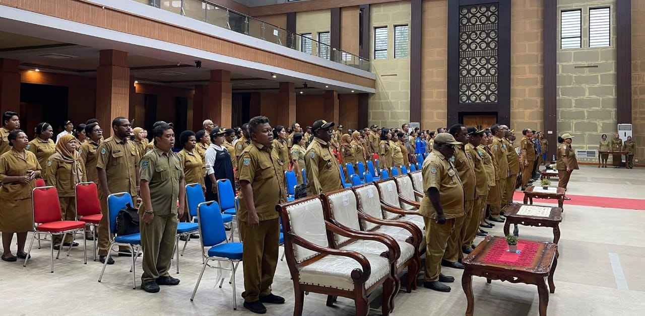 Akibat cuaca yang tidak mendukung, apel dilaksanakan di dalam ruangan dan dihadiri oleh jajaran Staf Ahli, Asisten, Pimpinan Organisasi Perangkat Daerah (OPD), Kepala Distrik, Lurah, hingga staf ASN.